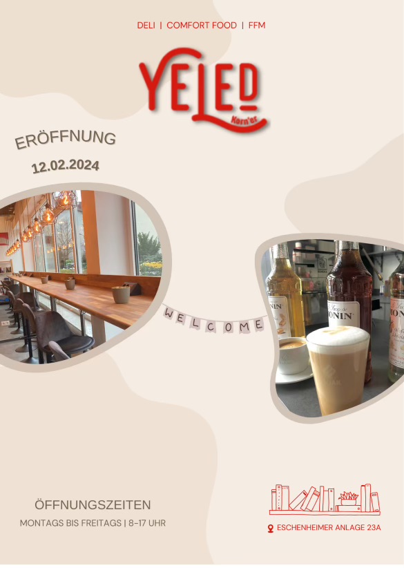 Ich habe mein Café mit der Vision eröffnet, einen Raum zu schaffen, der nicht nur zum Lernen und Arbeiten einlädt, sondern auch zum Entspannen, Runterkommen und vor allem zum gemeinsamen Miteinander. Hier könnt ihr in entspannter Atmosphäre eure Gedanken fließen lassen, euch mit anderen austauschen und neue Freundschaften knüpfen. Ob ihr nun lokale Nachbarn seid oder von weit herkommt, bei Yeled heißen wir jeden herzlich willkommen. Unser Ziel ist es, eine Gemeinschaft zu schaffen, in der sich jeder wohl und willkommen fühlt, ohne Vorurteile oder Barrieren. Taucht ein in die Welt von Yeled, lasst euch von unseren köstlichen Kaffeespezialitäten und Snacks verwöhnen und erlebt, wie aus einem einfachen Café ein Ort des Zusammenseins und der Begegnung wird. Wir freuen uns darauf, euch bei uns begrüßen zu dürfen!